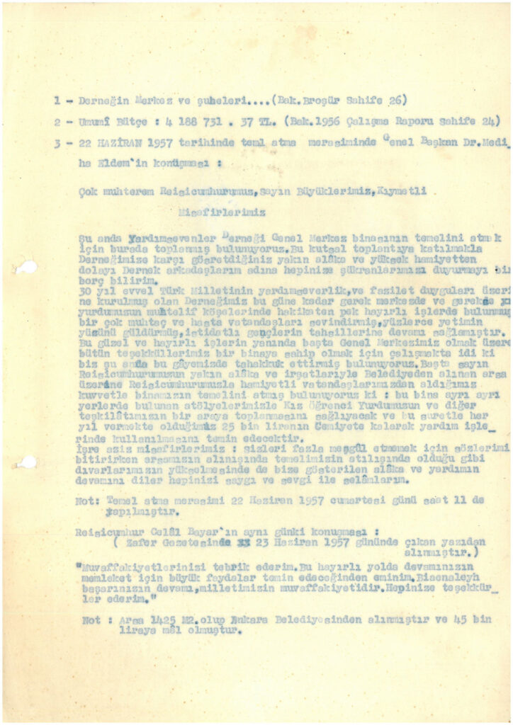 22 Haziran 1957 tarihinde yapılacak olan Genel Merkez binasının temel atma töreninde genel başkan Mediha Eldem’in konuşmasını ve diğer detayları içermektedir. Türkiye Yardım Sevenler Derneği.