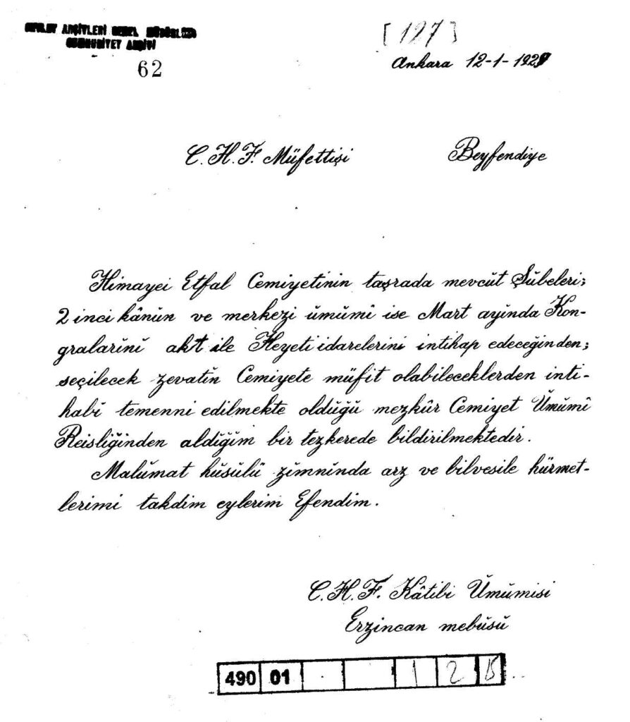 1928 yılında Himaye-iEtfal Cemiyeti idare heyeti seçimi ile ilgili Himaye-iEtfal Cemiyeti reisi Fuat bey ile Erzincan mebusunun karşılıklı yazışmalarının bulunduğu belgeler yer almaktadır.