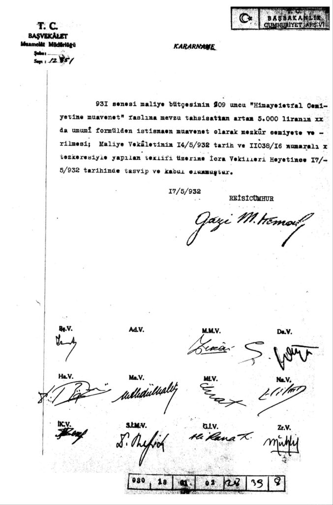 1931 yılı maliye bütçesinin 209. faslına artan paranın cemiyete verilmesinin kabul edildiğini bildiren kararnamedir. Devlet Arşivleri Genel Müdürlüğü.