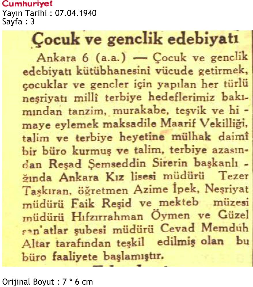 7 Nisan 1940 tarihinde Cumhuriyet Gazetesi 3. sayfada yer alan talim ve terbiye heyetine mülhak daimi bir büronun kurulması ve Tezer Taşkıran’ın da görev aldığını bildiren haberdir.
