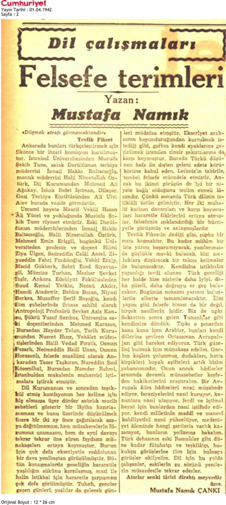 1 Nisan 1942 tarihinde Cumhuriyet Gazetesi 2. sayfada Mustafa Namık’ın “Felsefe Terimleri” adlı yazısında yer alan Felsefe terimlerinin Türkçeleştirilmesi için ihrazi komisyonun kurulduğunu ve Tezer Taşkıran’ın da komisyonda görev aldığını ifade eden haberdir.