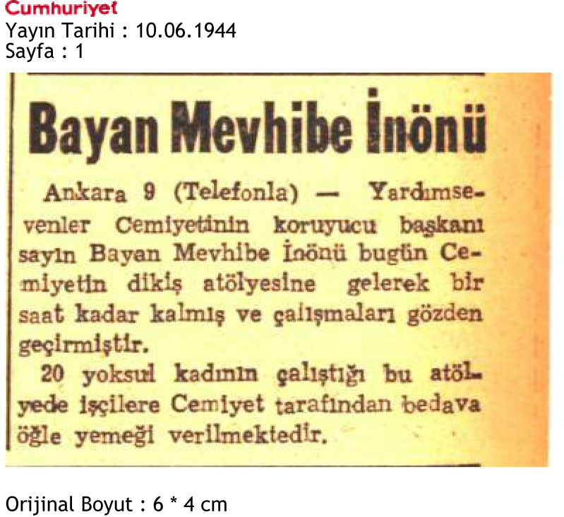 10 Haziran 1944 tarihinde Cumhuriyet Gazetesi 1. sayfada yer alan Mevhibe İnönü’nün Yardımsevenler Cemiyeti’nin dikiş atölyesini ziyaret etmesini ele alan haberdir.