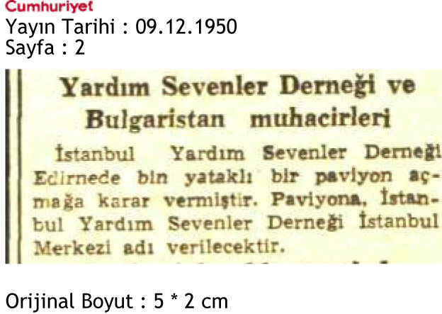 9 Aralık 1950 tarihinde Cumhuriyet Gazetesi 2. sayfada yer alan Derneğin Edirne’de 1000 yatakklı paviyon açmaya karar vermesini içeren haberdir.