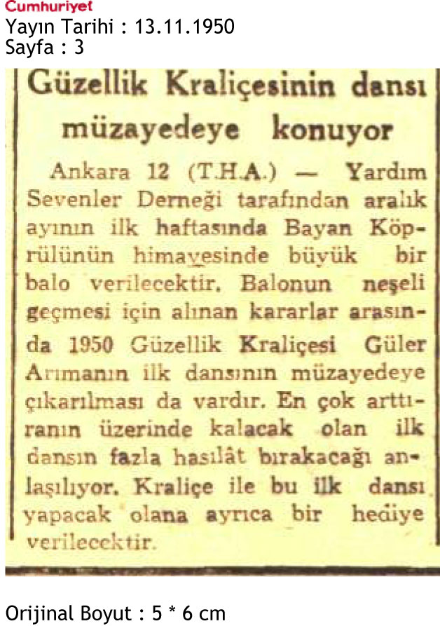 13 Kasım 1950 tarihinde Cumhuriyet Gazetesi 3.sayfada yer alan 1950 Güzellik Kraliçesi Güler Arıman’ın dansının müzayedeye çıkarılmasına karar verildiğini belirten haberdir.
