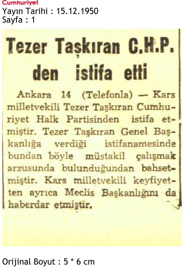 15 Aralık 1950 tarihinde Cumhuriyet Gazetesi 1. sayfada yer alan CHP Kars Milletvekili Tezer Taşkıran’ın CHP’ten istifa ettiğini bildiren haberdir.
