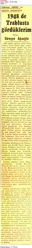 27 Şubat 1952 tarihinde Cumhuriyet Gazetesi 3. sayfada yer alan Süreyya Ağaoğlu’nun “1948’de Trablusta Gördüklerim” adlı yazısını ifade eden haberdir.