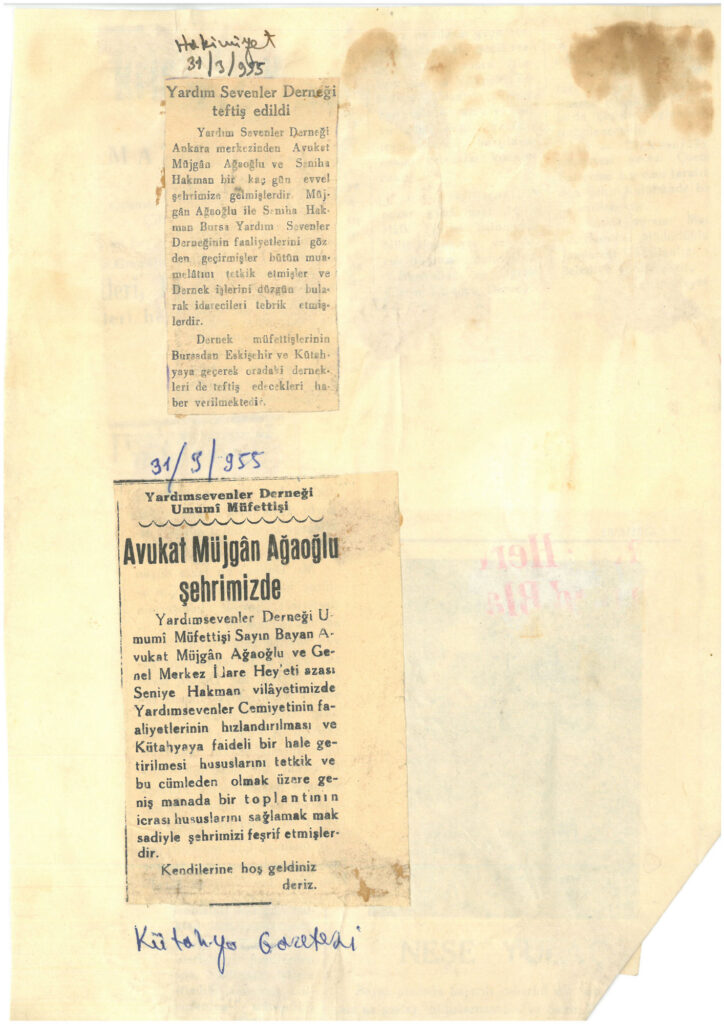 31 Mart 1955 tarihinde Kütahya yardım Sevenler derneğinin Avukat Müjgan Ağaoğlu tarafından teftiş edilmesini içeren haber yazılarıdır. Hakimiyet Gazetesi.