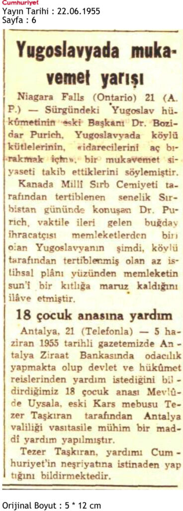 22 Haziran 1955 tarihinde Cumhuriyet Gazetesi 5. sayfada yer alan 18 çocuk anasına Tezer Taşkıran’ın Antalya Valiliği aracılığıyla yardım ettiğini bildiren haberdir.