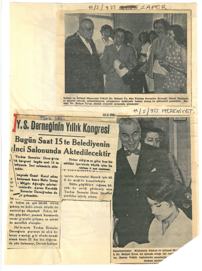 19 Şubat 1955 tarihinde yer alan haberde Türkiye Yardım Sevenler Derneğinin saat 15.00’de yapılacak olan yıllık kongresinin bilgileri yer almaktadır. 11 Mayıs 1955 tarihinde yer alan haberlerde ise Dr. Behçet Uz’un Yardım Sevenler Derneğini ziyareti yer almaktadır. Türk Sesi, Medeniyet ve Zafer.
