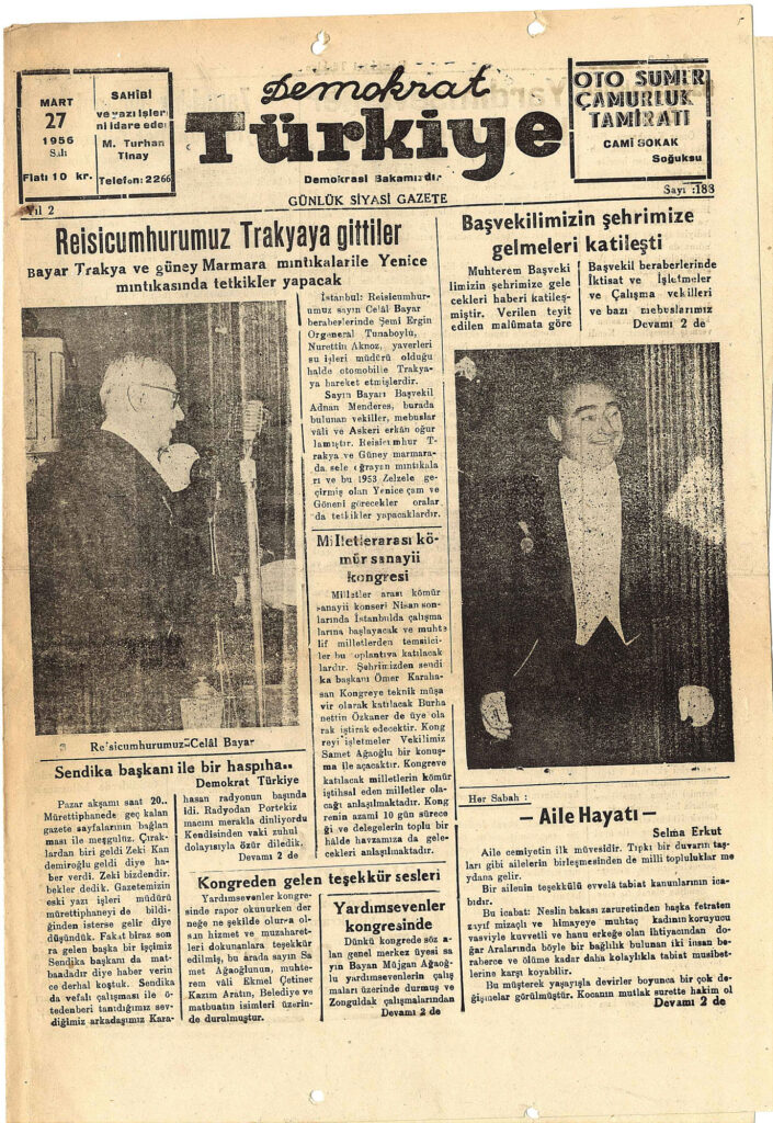 27 Mart 1956 tarihinde Demokrat Türkiye gazetesinin 1. sayfasında yapılan kongre yer almaktadır. 2. sayfada ise Kongrede söz alan Müjgan Ağaoğlu’nun konuşması yer almaktadır. Demokrat Türkiye.