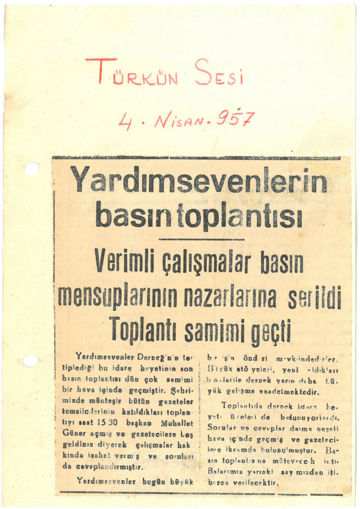 4 Nisan 1957 tarihinde Türkün Sesi gazetesinde Yardımseverlerin son basın toplantısı haberi yer almaktadır. Türkün Sesi.