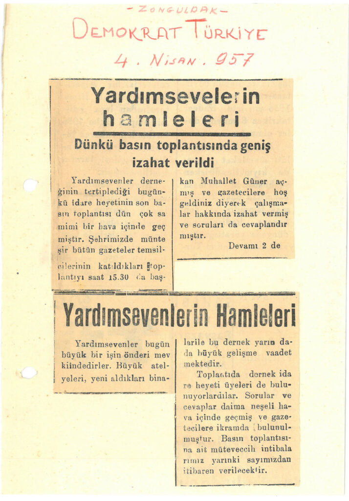 4 Nisan 1957 tarihinde Demokrat Türkiye (Zonguldak) gazetesinde yer alan bir önceki gün gerçekleştirilen basın toplantısını içeren haberdir. Demokrat Türkiye.