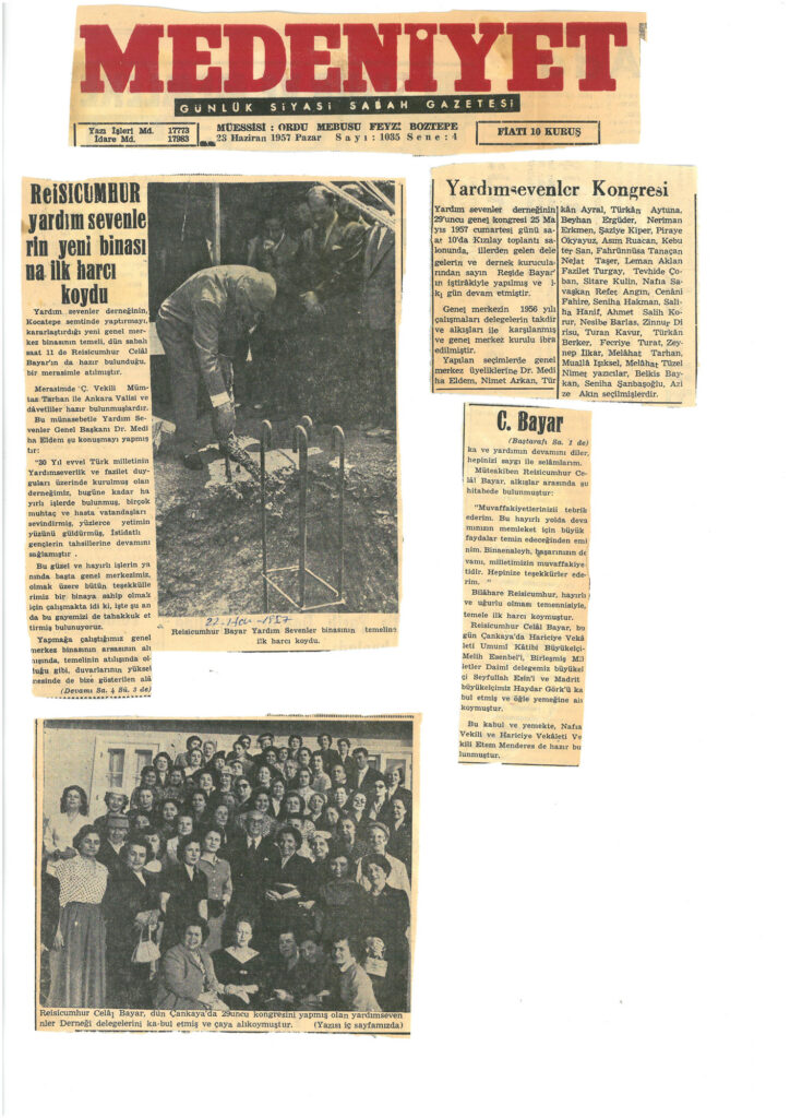 Medeniyet gazetesinin 22 Haziran 1957 tarihindeki haberinde Reisicumhur Celal Bayar’ın Yardım Sevenler Derneğinin yapılacak olan binasına ilk harcı koyduğu yer almaktadır. 28 Haziranda tarihindeki gazetede ise Yardım Sevenler Derneğinin 29. kongresine katılan Celal Bayar ve diğer konuklarla ilgili haberler yer almaktadır.