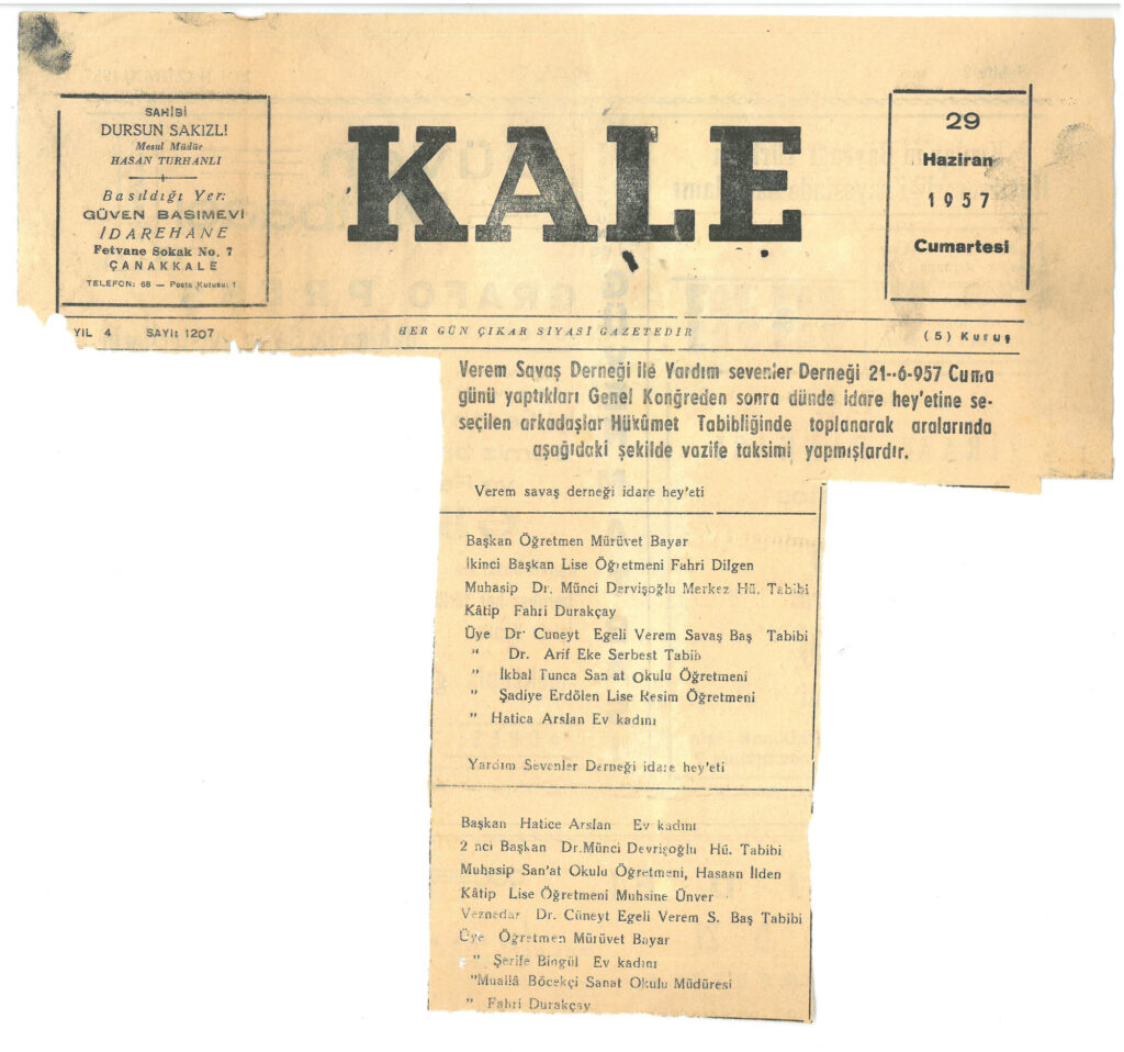 29 Haziran 1957 tarihinde Kale gazetesinde Verem Savaş Derneği ile Yardım Sevenler Derneğinin 21 Haziran günü yaptıkları genel kongreden sonra idare heyetine seçilenlerin Hükümet tabibliğinde toplanarak vazife paylaşımı yaptıklarını bildiren haberdir.