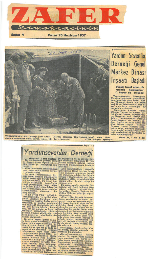 Zafer gazetesinin 22 Haziran 1957 tarihindeki haberinde Reisicumhur Celal Bayar’ın Yardım Sevenler Derneğinin yapılacak olan binasına ilk harcı koyduğu yer almaktadır.