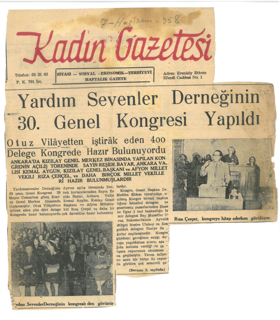 7 Haziran 1958 Tarihli Kadın Gazetesinde Yardım Sevenler Derneğinin 30. Genel Kongresinin yapıldığını bildiren haberdir.