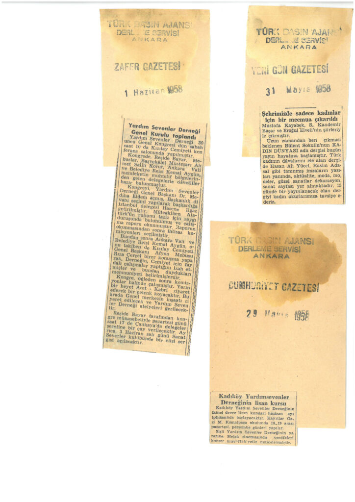 29 Mayıs 1958 tarihli Cumhuriyet gazetesinde Kadıköy Yardım Sevenler Derneğinin lisan kursu haberi yer alırken, 31 Mayıs 1958 tarihli Yeni Gün gazetesinde sadece kadınlara özel olan mecmuadan bahsedilmiştir. 1 Haziran 1958 tarihli Zafer Gazetesinde de derneğin genel kurulunun haberi yer almaktadır.