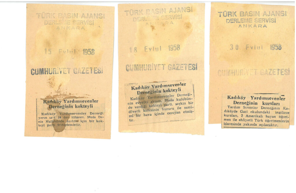 Eylül 1958 Tarihlerinde Cumhuriyet Gazetesinde Kadıköy Yardım Sevenler Derneğinin yaptığı çalışmalara ilişkin haberler yer almaktadır.
