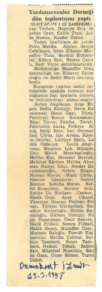 29 Mart 1958 tarihinde Demokrat İzmir gazetesinde Yardım Sevenler Derneğinin yaptığı toplantıya ilişkin haber yer almaktadır.