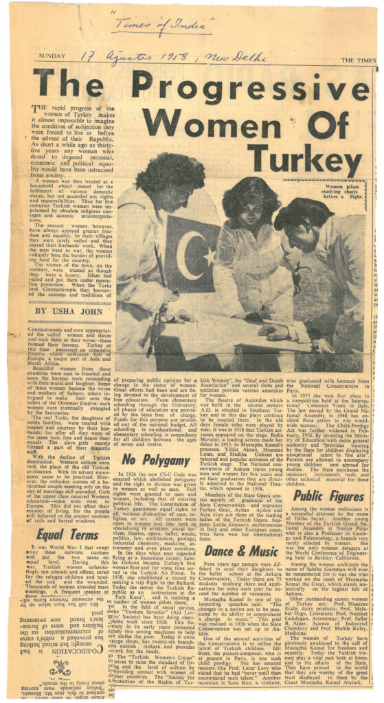 17 Ağustos 1958 tarihinde The Times gazetesinde çıkan Türkiye’nin ilerici kadınları başlıklı İngilizce içerikli haberdir.