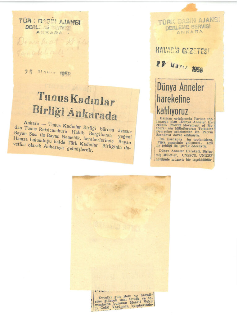 Mayıs 1958 yılına ait Demokrat gazetesinde Tunus Kadınlar birliğinin Ankara’ya gelişi ve Havadis gazetesinde ise Dünya Anneler Günü Hareketine katılma ile ilgili yer alan haberler bulunmaktadır.