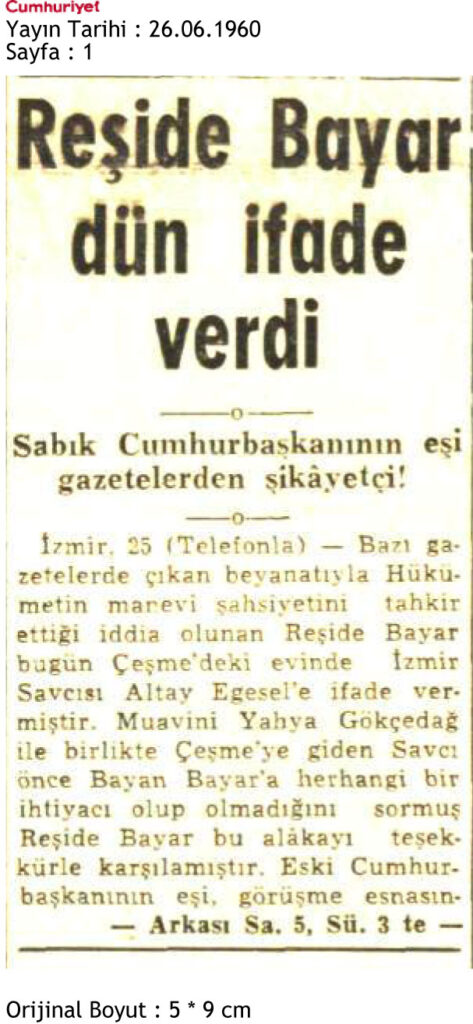 26 Haziran 1960 tarihinde Cumhuriyet Gazetesi 1. sayfada yer alan hükümetin manevi şahsiyetini tahkir ettiği iddia edilen Reşide Bayar’ın Çeşme’deki evinde Savcıya ifade vermesini bildiren haberdir.
