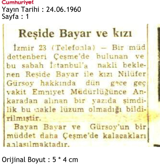 24 Haziran 1960 tarihinde Cumhuriyet Gazetesi 1. sayfada yer alan Reşide Bayar ve kızı Nilüfer Gürsoy’un bir müddet daha Çeşme’de kalmaları gerektiğini anlatan haberdir.