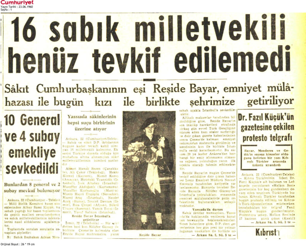 23 Haziran 1960 tarihinde Cumhuriyet Gazetesi 1. ve 5. sayfada yer alan Reşide Bayar’ın kızı ile birlikte İstanbul’a getirileceğini ifade eden haberdir.