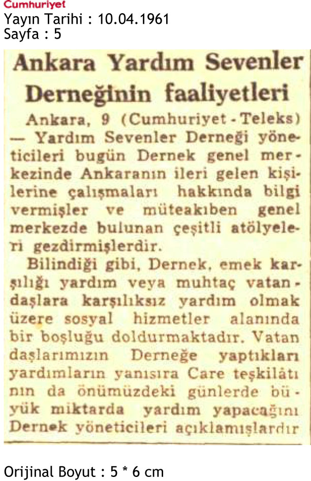 10 Nisan 1961 tarihinde Cumhuriyet Gazetesi 5. sayfasında yer alan haberde Yardım Sevenler Derneğinin Genel Faaliyetleri yer almaktadır.