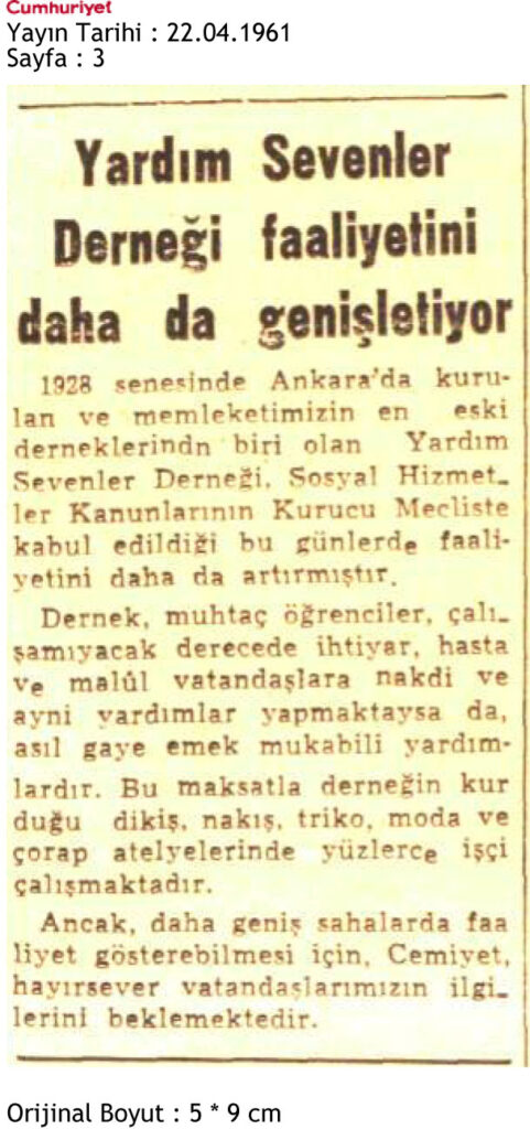 22 Nisan 1961 tarihinde Cumhuriyet Gazetesinin 3. sayfasında yer alan haberde Derneğin nakdi yardımlarının yanı sıra kurduğu dikiş, nakış, triko ve çorap atölyelerinde yüzlerce işçinin çalıştığını ve yardım alanını genişlettiklerini anlatan haber yer almaktadır.