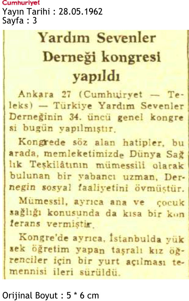 28 Mayıs 1962 tarihinde Cumhuriyet Gazetesinin 3. sayfasında yer alan haberde Yardım Sevenler Derneğinin 34. Genel Kongresinin yapıldığı ve taşralı kız öğrenciler için bir kız yurdu açılması temennisinde bulunulduğu görülmektedir.