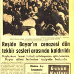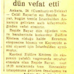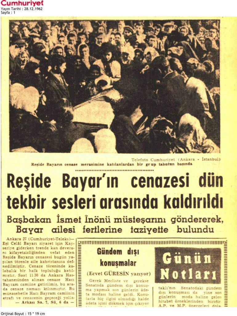 25 Aralık 1962 tarihinde Cumhuriyet Gazetesi 1. ve 5. sayfada yer alan Reşide Bayar’ın İstanbul’dan Ankara’ya yolculuğunda kalp kıfayetsizliğinden vefat ettiğini bildiren haberdir.