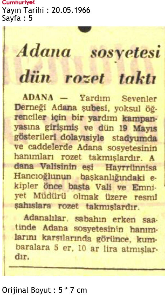 20 Mayıs 1966 tarihinde Cumhuriyet Gazetesi 5. sayfasında yer alan haberde Adana Yardım Sevenler Derneğinin yoksul öğrenciler için yardım kampanyası düzenlediği ve bu çerçevede de sosyeteye mensup hanımlara rozet takıldığı yer almaktadır.