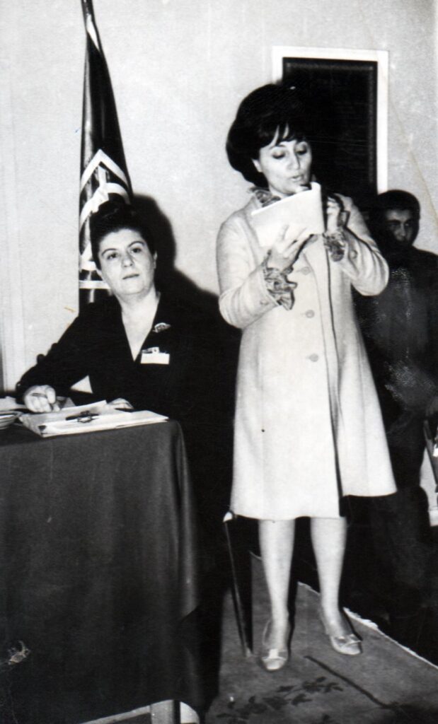1968’de Birsen Eldem’in 40. Genel Kurul’da Faaliyet Raporu okurken çekilen fotoğraf yer almaktadır. Türkiye Yardım Sevenler Derneği.