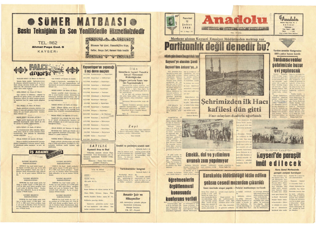 12 Şubat 1968 tarihli Anadolu Gazetesinde Yardım Sevenler Derneğinin Kayseri’ye bir huzur evi yaptıracağı ile ilgili olan haberdir.