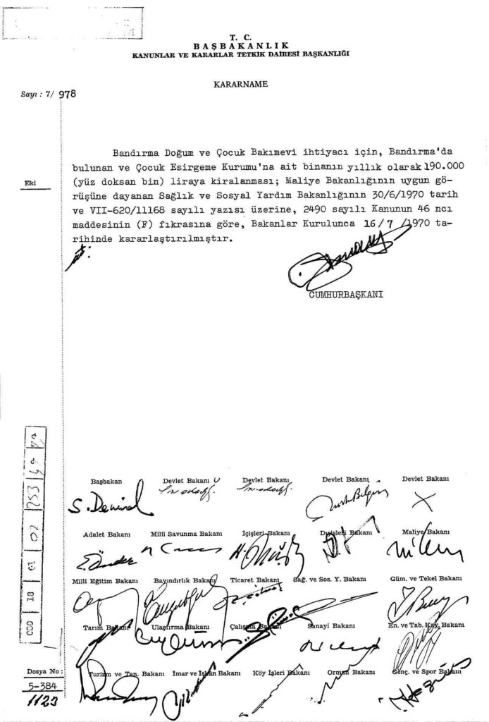 Bandırma Doğum ve Çocuk Bakımevi’nin ihtiyacı için Çocuk Esirgeme Kurumu’na ait binanın kiralanmasına karar verildiğini açıklayan kararnamedir. Devlet Arşivleri Genel Müdürlüğü.