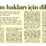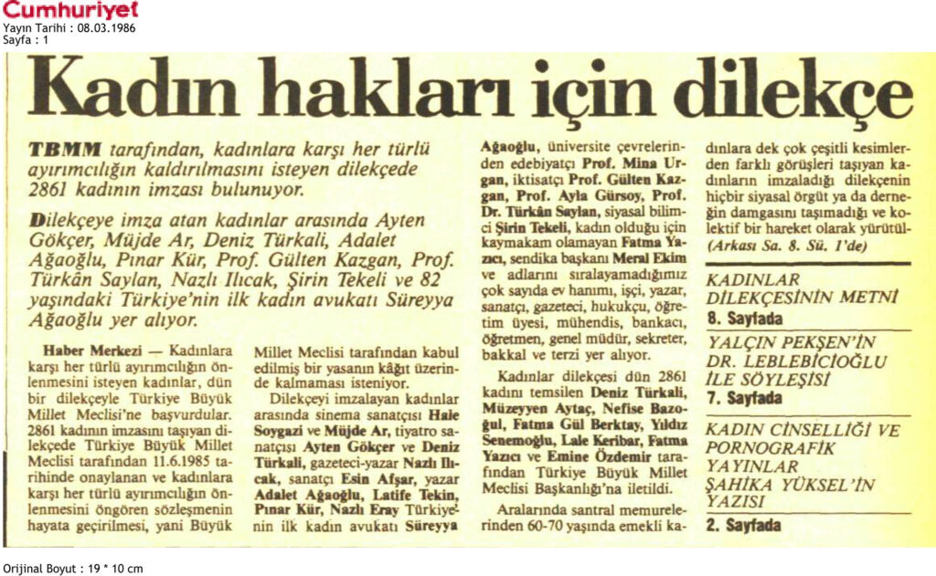 8 Mart 1986 tarihinde Cumhuriyet Gazetesinin 1. sayfasında yer alan haberde kadınlara karşı ayrımcılığın kaldırılması için TBMM’ye yazılan dilekçe de içlerinde Süreyya Ağaoğlu gibi önemli isimlerinde bulunduğu 2861 kadının imzasının yer aldığı görülmektedir. Gazetenin 8. sayfasında ise Kadın hakları dilekçe metni bulunmaktadır.