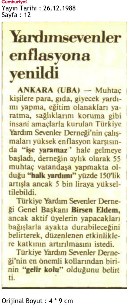 26 Aralık 1988 tarihinde Cumhuriyet gazetesinin 12.sayfasında yer alan haberde derneğin artan enflasyon karşında zor durumda olduğunu ve ancak aktif üyelerin bağışlarıyla ayakta kalınabileceği ifadesi yer almaktadır.