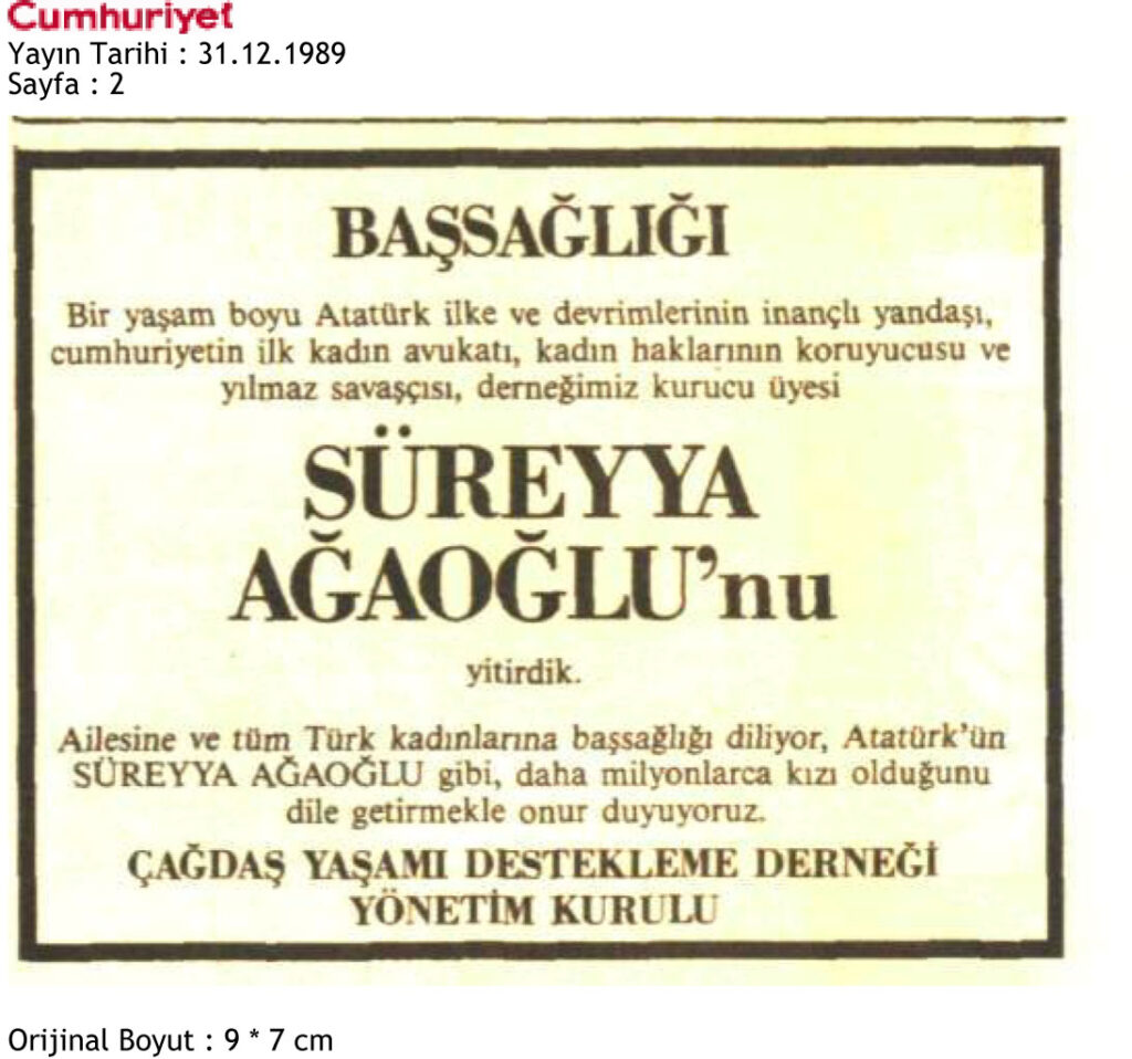 31 Aralık 1989 tarihinde Cumhuriyet Gazetesi 2. sayfasında yer alan Süreyya Ağaoğlu’nun vefatını içeren haberdir.