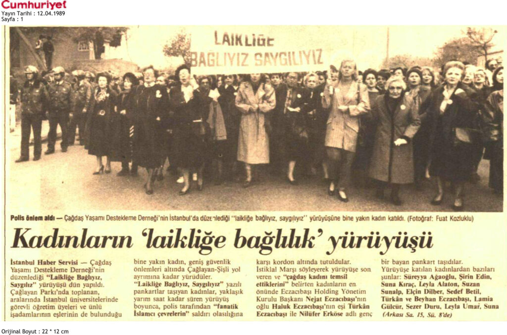 12 nisan 1989 tarihinde Cumhuriyet Gazetesi 1. sayfada yer alan Süreyya Ağaoğlu’nun da katıldığı Çağdaş Yaşamı Destekleme Derneği’nin düzenlediği yürüyüşten görüntü yayınlayan haberdir.