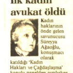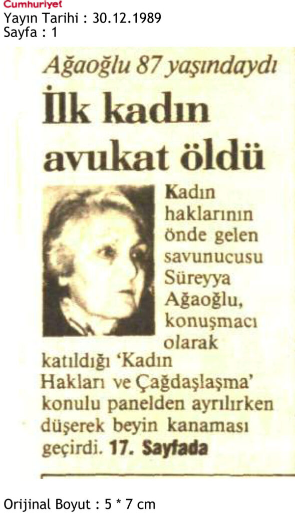 30 Aralık 1989 tarihinde Cumhueiyet Gazetesi 1. ve 17. sayfalarda yer alan Türkiye’nin ilk kadın Avukatı Süreyya Ağaoğlu’nun hayatını kaybettiğini bildiren haberdir.
