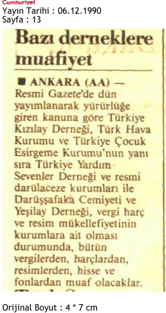 6 Aralık 1990 tarihinde Cumhuriyet Gazetesinin 13. sayfasında yer alan haberde yayınlanan kanuna göre yardım sevenler derneğinin de içinde bulunduğu bazı kurumların vergi, harç ve resim mükellefiyetinin kendilerine ait olması durumunda tüm vergilerden, resimlerden, harçlardan muaf olacakları belirtilmektedir.