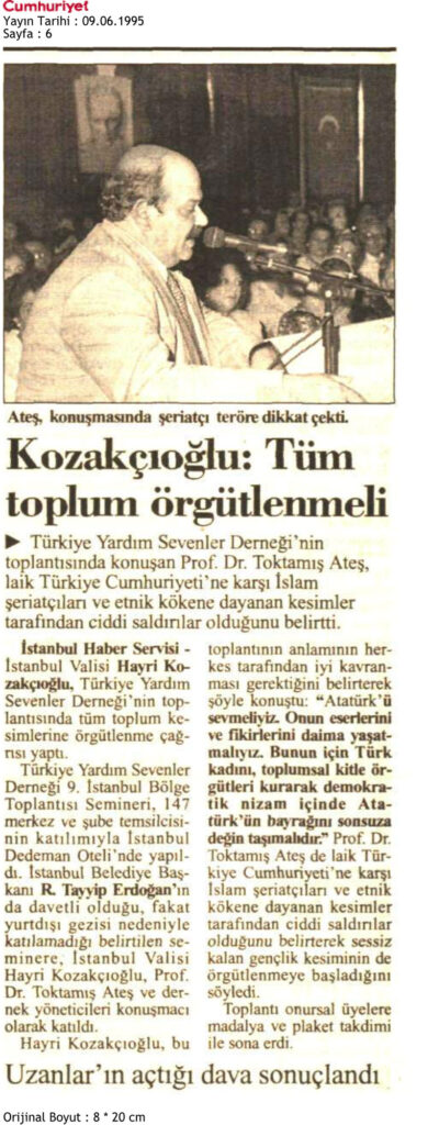 9 Haziran 1995 tarihinde Cumhuriyet Gazetesinin 6. sayfasında yer alan haberde Yardım Sevenler Derneğinin toplantısında konuşan Toktamış Ateş ve İstanbul Valisi Hayri Kozakçıoğlu’nun konuşmalarına yer verilmiştir.