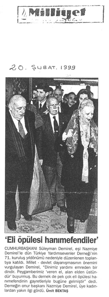 20 Şubat 1999 tarihli Milliyet gazetesinin haberi Yardım Sevenler Derneğinin 71. kuruluş yılı sebebiyle toplanıldığında Cumhurbaşkanı Süleyman Demirel’in övgülerini içermektedir. Milliyet Gazetesi.