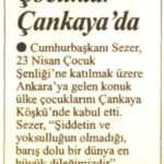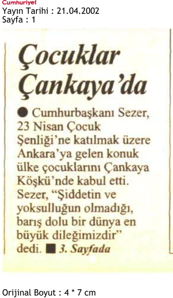 21 Nisan 2002 tarihinde Cumhuriyet Gazetesinin 1. sayfasında yer alan haberde Cumhurbaşkanı Sezer’in Dünya çocuklarını Çankaya köşküne konuk etmesi yer almaktadır. Gazetenin 3. sayfasında ise TÜKSEV’in 23 Nisan Projesine Yardım Sevenler Derneğinin de katkıda bulunduğu haberi yer almaktadır.
