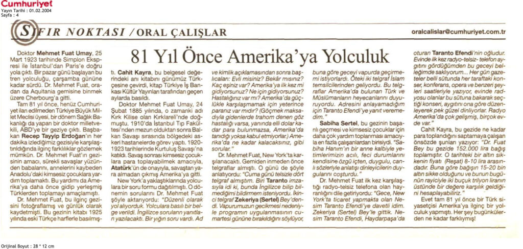 1 şubat 2004 tarihinde Cumhuriyet Gazetesi 4. sayfada yer alan Doktor Mehmet Fuat Umay’ın 81. yıl önce Amerika’ya yolculuğuna değinen haberdir.
