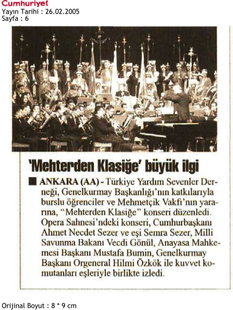 26 Şubat 2005 tarihinde Cumhuriyet gazetesinin 6. sayfasında yer alan haberde Türkiye Yardım Sevenler Derneği ve Genelkurmay Başkanlığının Katkılarıyla düzenlenen yardım konserine ait bilgilere yer verilmiştir.