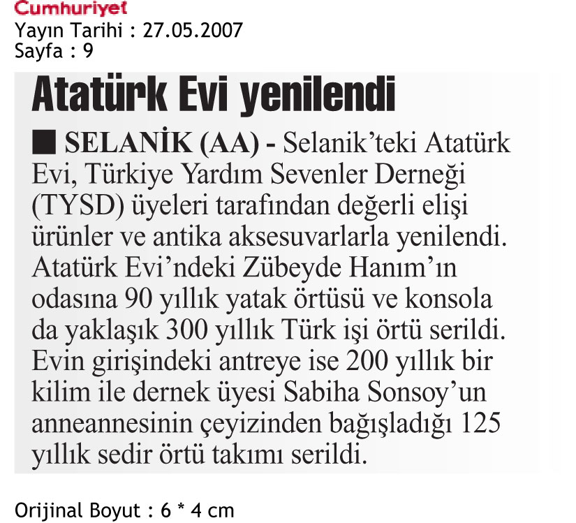 27 Mayıs 2007 tarihinde Cumhuriyet gazetesinin 9. sayfasında yer alan Türkiye Yardım Sevenler Derneği üyeleri tarafından değerli elişi ürünler ve antika aksesuarlarla nasıl yenilendiğini anlatan haberdir.