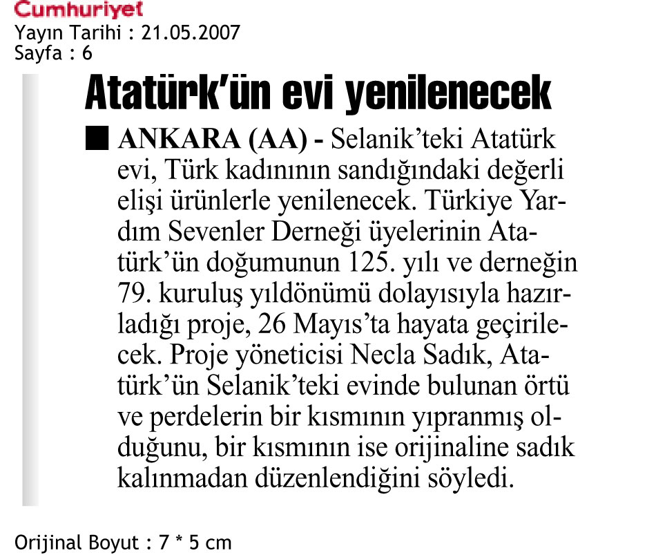 27 Mayıs 2007 tarihinde Cumhuriyet gazetesinin 6. sayfasında yer alan Selanik’teki Atatürk evinin Türk kadınının sandığındaki değerli elişi ürünlerle yenilenmesi için bir proje başlatıldığını içeren haberdir.