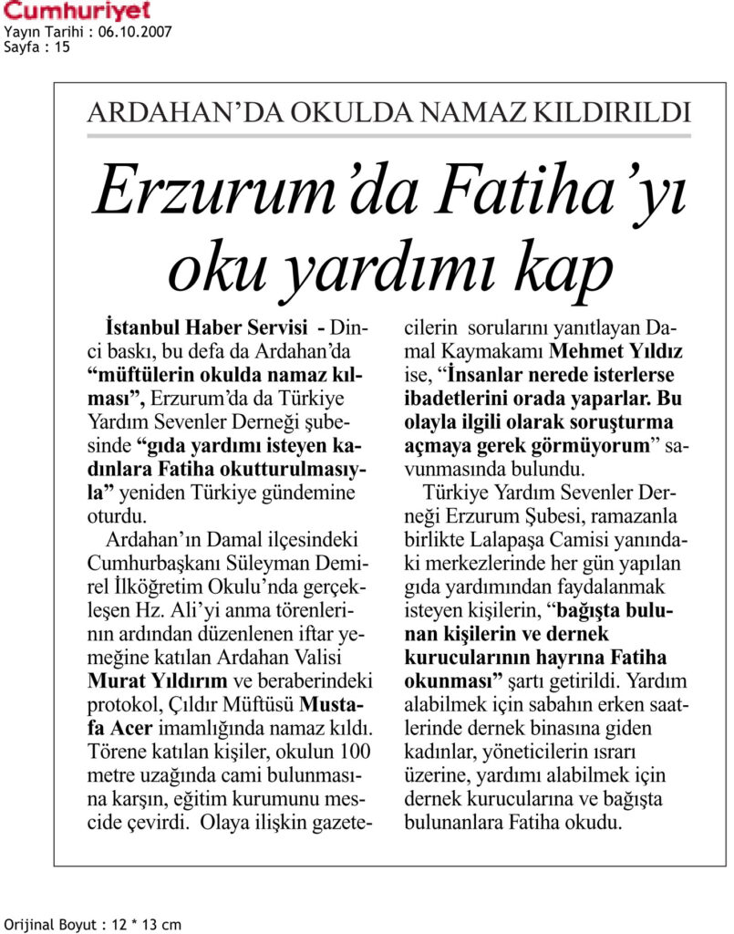 6 Ekim 2007 tarihinde Cumhuriyet gazetesinin 15. sayfasında yer alan Türkiye Yardım Sevenler Derneği Erzurum Şubesi, ramazanla birlikte her gün yapılan gıda yardımından faydalanmak isteyen kişilerin, “bağışta bulunan kişilerin ve dernek kurucularının hayrına Fatiha okunması” şartı getirmesi ile ilgili olan haberdir.